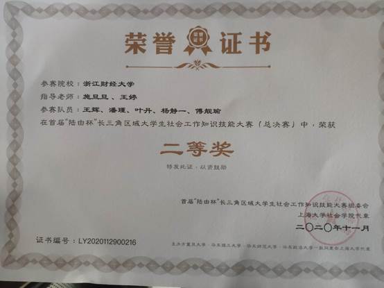 我院社会工作系同学组成了两支队伍,积极参与比赛,其中,我院社会工作系学生王辉、潘瑾、叶丹、杨静一、傅靓瑜组成的“财院菜宝社工团”队伍在社会工作系指导老师施旦旦老师、王婷老师的带领下,取得了二等奖的好成绩。