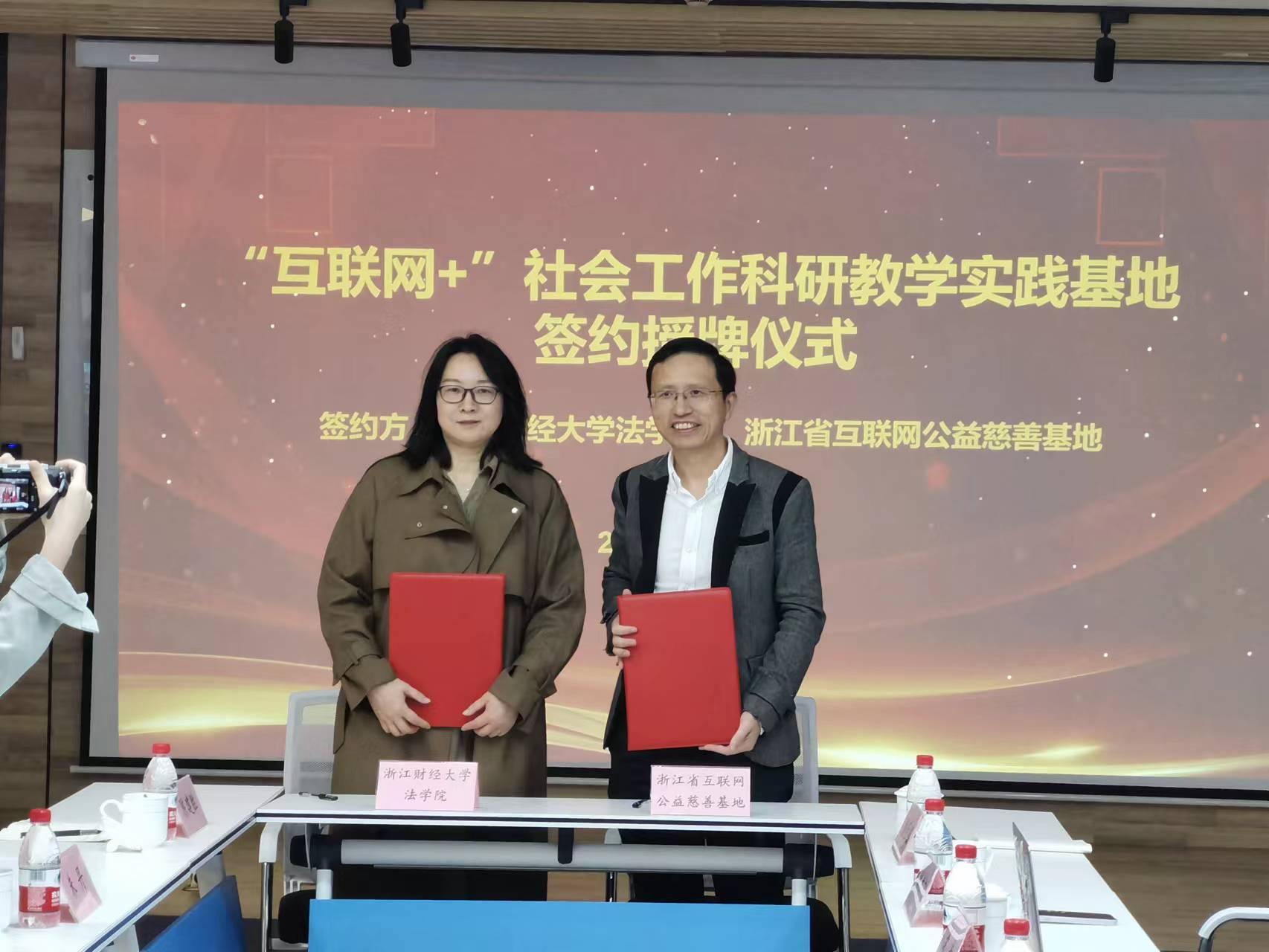 紧接着是实践基地签约仪式。基地主任裘涵与朱丹老师分别代表浙江省互联网公益慈善基地和必赢线路检测中心发言。在发言过程中,裘主任详细地为师生们讲解了浙江省互联网慈善基地数字化探索的内容,而朱丹书记则介绍了必赢线路检测中心社会工作系的发展历史,并对“互联网+”社会工作科研教学实践基地的共建提出了美好期许。接下来,双方针对未来的合作展开了热烈且真挚的探讨,就“互联网+”社会工作科研教学实践基地共建达成一系列共识。在现场,朱丹书记和裘涵主任签订了合作协议,陈建胜老师代表必赢线路检测中心向基地授牌。